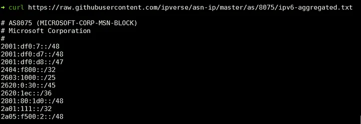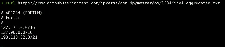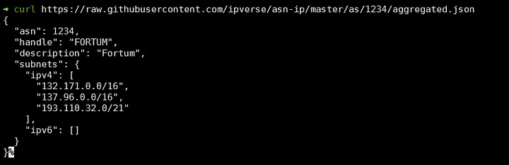 We discussed that ASN contains a wide range of IPv4 and v6 subnets. There is a github repo which contains all the IP subnets under a AS. We can query this database by using the ASN number. Repo can be found here